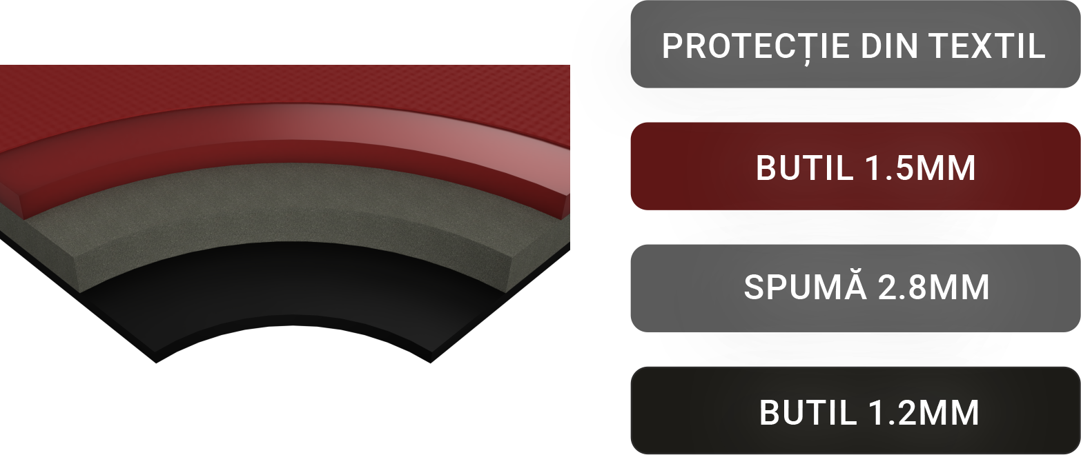 Structura tip sandwich include doua straturi de cauciuc butilic si un strat central de spuma fonoizolatoare, oferind un echilibru foarte bun intre absorbtia vibratiilor si izolarea fonica. Este potrivit pentru cei care cauta un material insonorizant auto eficient, durabil si usor de aplicat pe diverse suprafete.