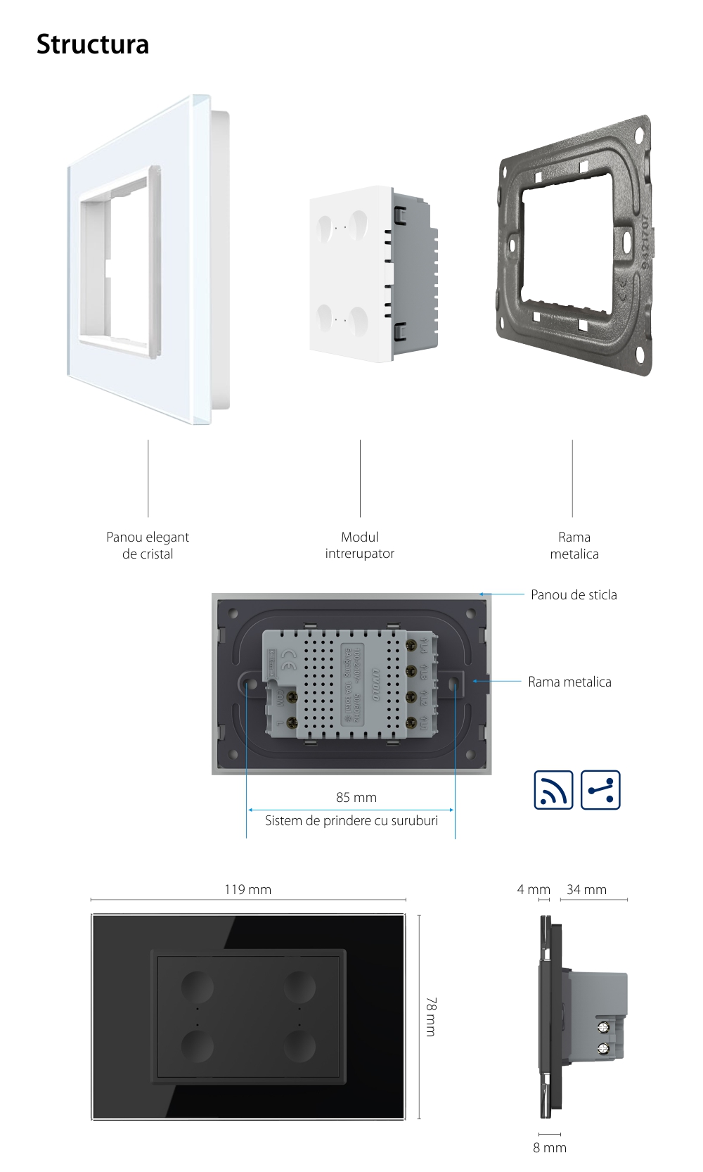 Intrerupator cvadruplu cap scara / cap cruce wireless cu touch Livolo cu rama din sticla, standard Italian - Serie noua SmartElectro IntelligentHouse