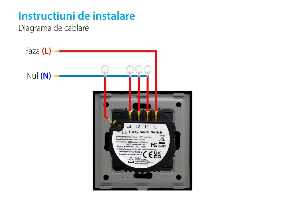 Specificatii Intrerupator Cvadruplu Touch Sticla LUXION, 500W