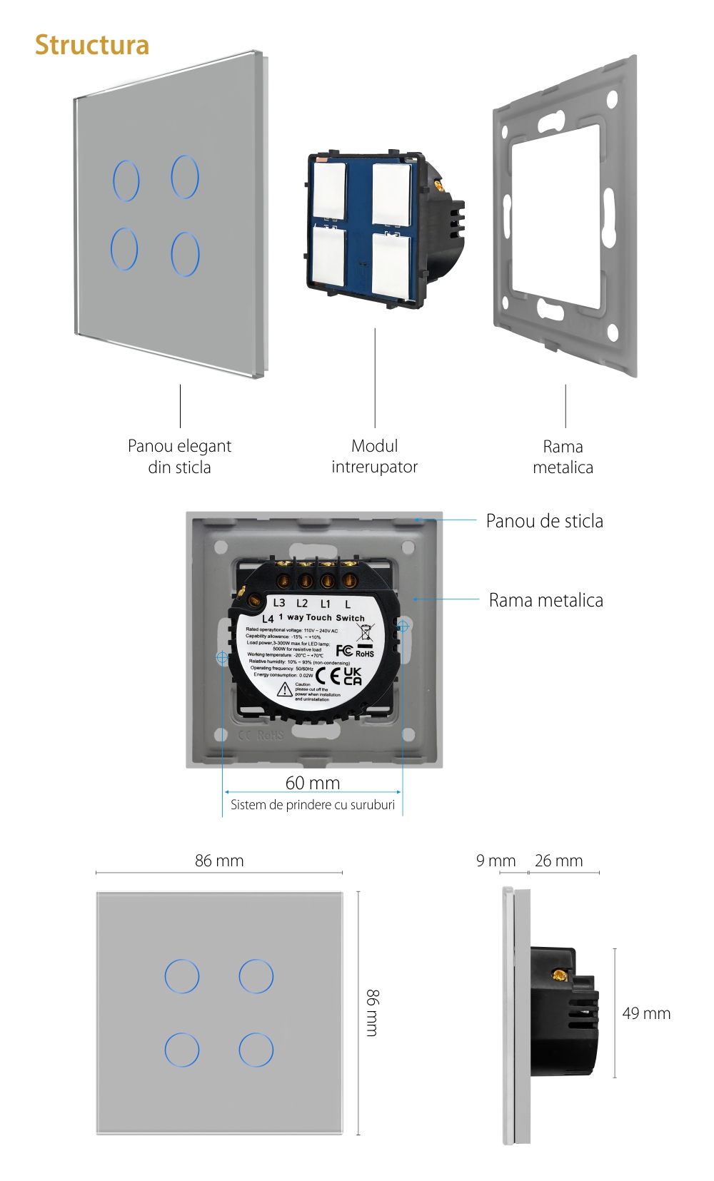 Descriere Intrerupator Cvadruplu Touch Sticla LUXION, 500W