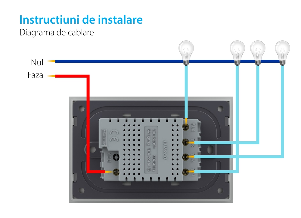 Specificatii Intrerupator cvadruplu touch Livolo sticla -