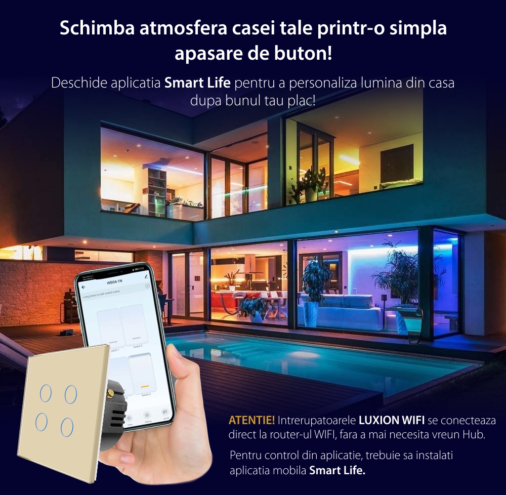 Intrerupator cvadruplu Wi-Fi + RF433 cu touch din sticla Luxion. Brand-ul de intrerupatoare LUXION se diferentiaza prin design-ul compact, elegant si minimalist. Sunt versatile, iar senzorul tactil este foarte precis, identic cu cel al unui smartphone. Structura este durabila, iar intrerupatoarele nu se decoloreaza in timp. Este un produs practic, fabricat din materiale de calitate si rezistent in timp, ce ofera utilitate si confort casei tale. Se poate monta pe instalatie cu nul sau se poate monta pe instalatie clasica insa doar alaturi de adaptorul Wifi Se poate controla cu ajutorul telecomenzii RF Luxion sau a telecomenzii tip breloc. Atentie, aceasta trebuie achizitionata separat!