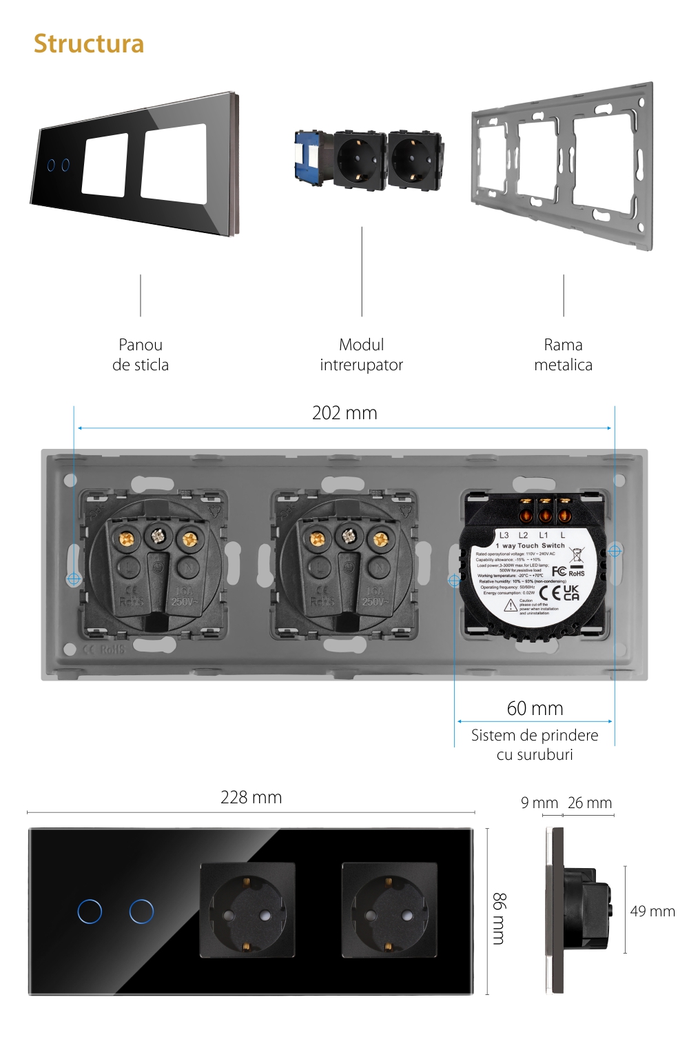 Specificatii Intrerupator Dublu + 2 Prize Rama