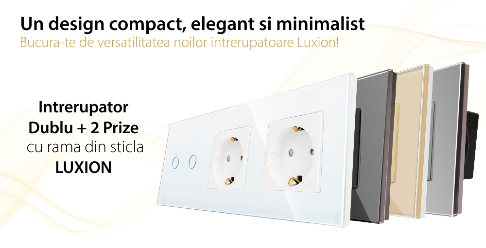 Intrerupator dublu + 2 prize cu rama din sticla LUXION cu design compact, elegant si minimalist. Structura este durabila, iar produsele nu se decoloreaza in timp. Este un produs practic, fabricat din materiale de calitate si rezistente in timp, ce ofera utilitate si confort casei tale.