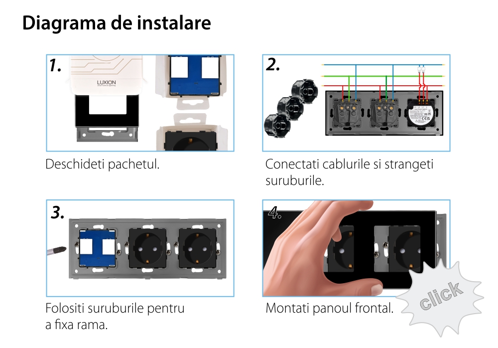 Intrerupator dublu + 2 prize cu rama din sticla LUXION cu design compact, elegant si minimalist. Structura este durabila, iar produsele nu se decoloreaza in timp. Este un produs practic, fabricat din materiale de calitate si rezistente in timp, ce ofera utilitate si confort casei tale.