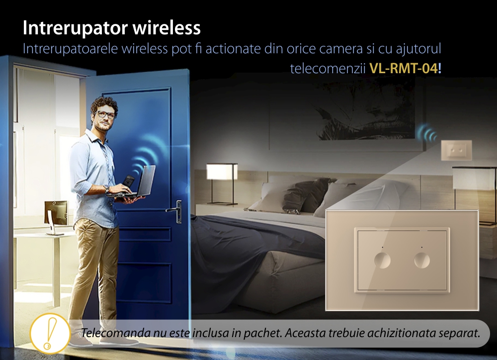 Intrerupator dublu cap scara / cap cruce wireless cu touch Livolo cu rama din sticla, standard Italian - Serie noua SmartElectro IntelligentHouse