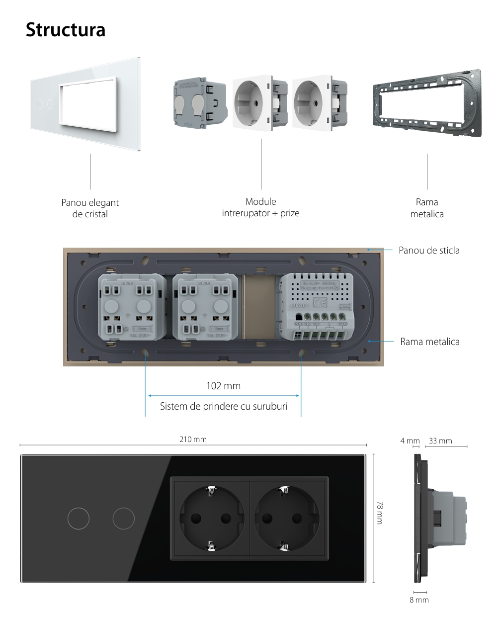 Intrerupator Dublu Cap Scara / Cruce + 2 Prize LIVOLO cu Rama Din Sticla, Standard Italian, 6M SmartElectro IntelligentHouse