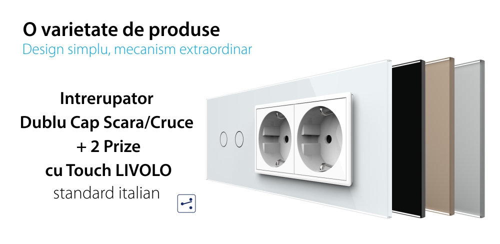 Intrerupator Dublu Cap Scara / Cruce + 2 Prize LIVOLO cu Rama Din Sticla, Standard Italian, 6M SmartElectro IntelligentHouse