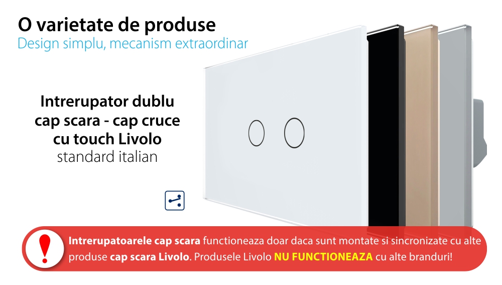 Intrerupator Dublu Cap Scara / Cruce cu Touch LIVOLO din Sticla – Standard Italian SmartElectro IntelligentHouse