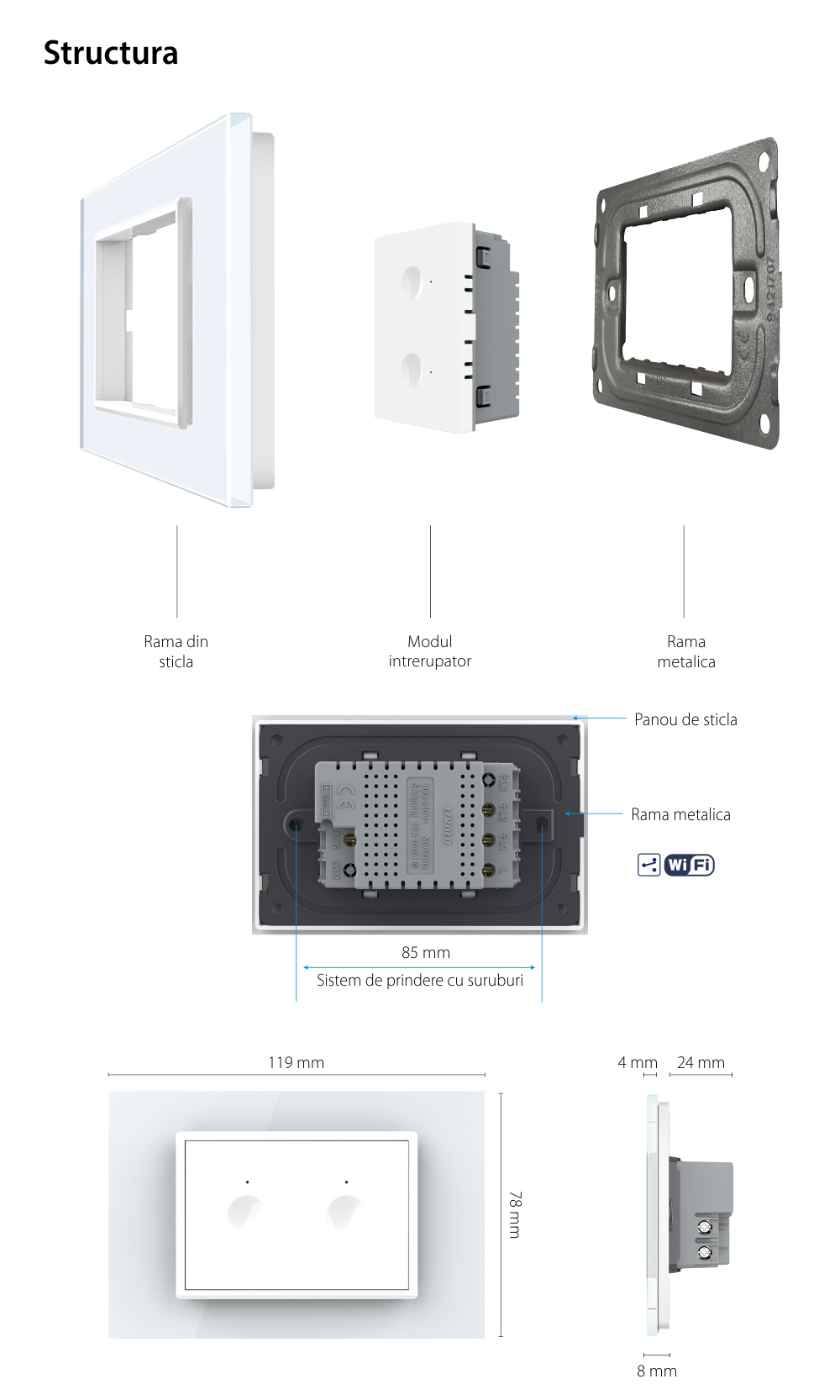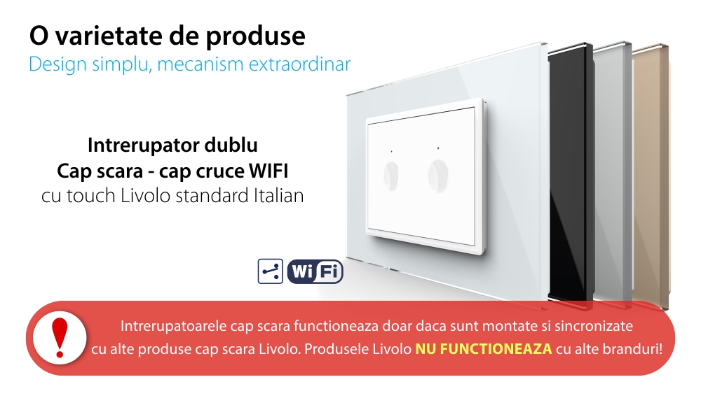 Intrerupator Dublu Cap Scara / Cruce Wi-Fi cu Touch LIVOLO cu rama din sticla, standard italian – Serie Noua, Alb SmartElectro IntelligentHouse