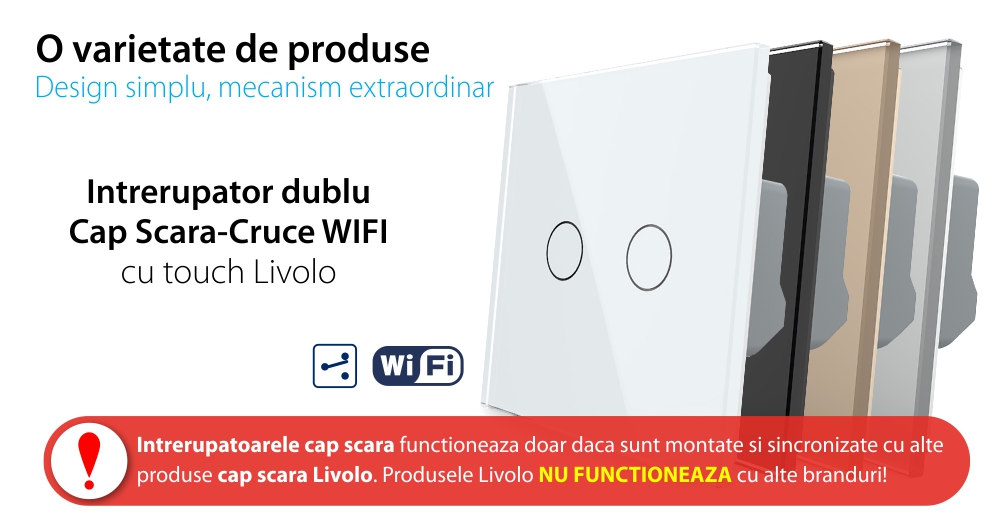 Intrerupator Dublu Cap Scara / Cruce Wi-Fi cu Touch LIVOLO din Sticla - Serie Noua SmartElectro IntelligentHouse