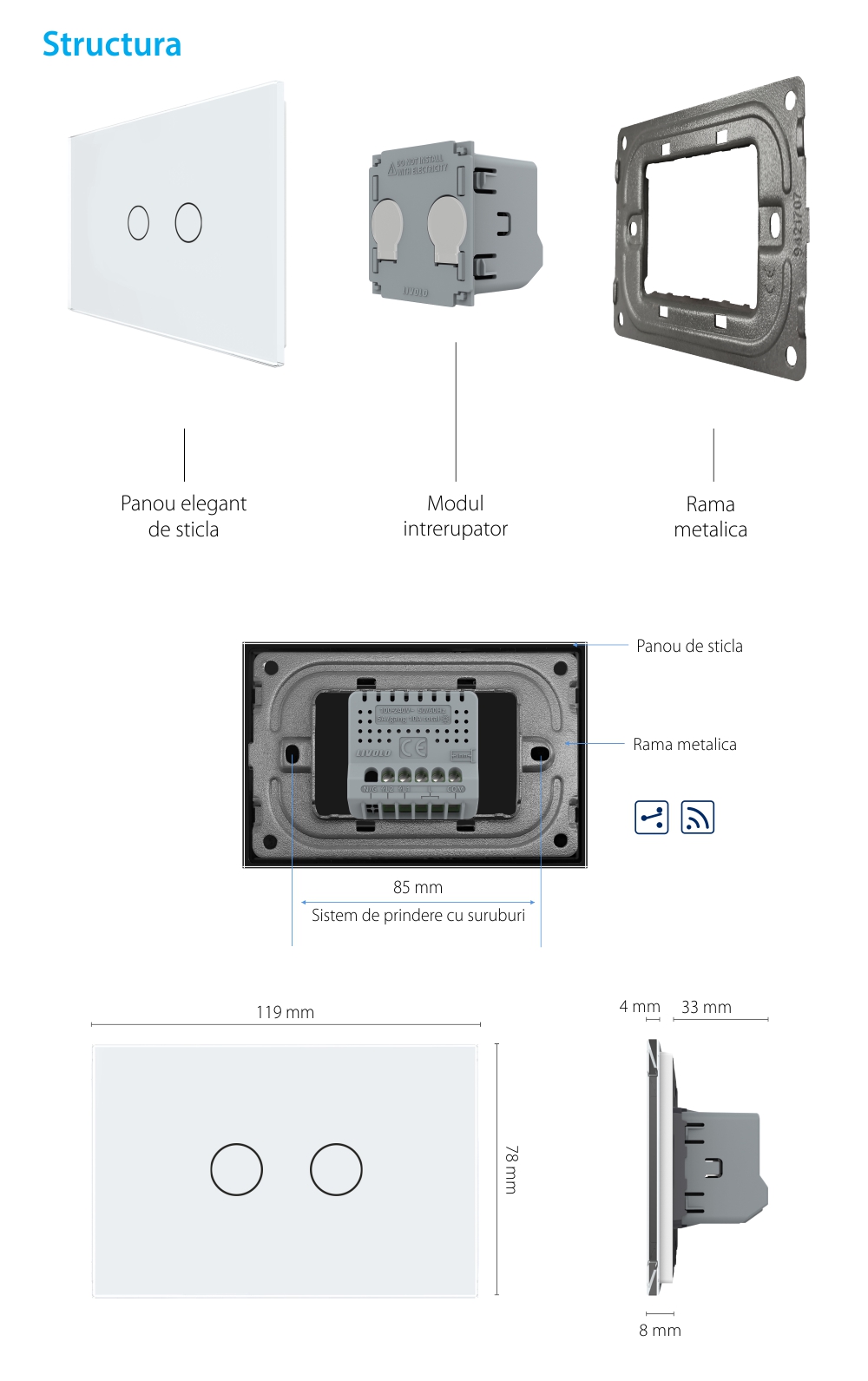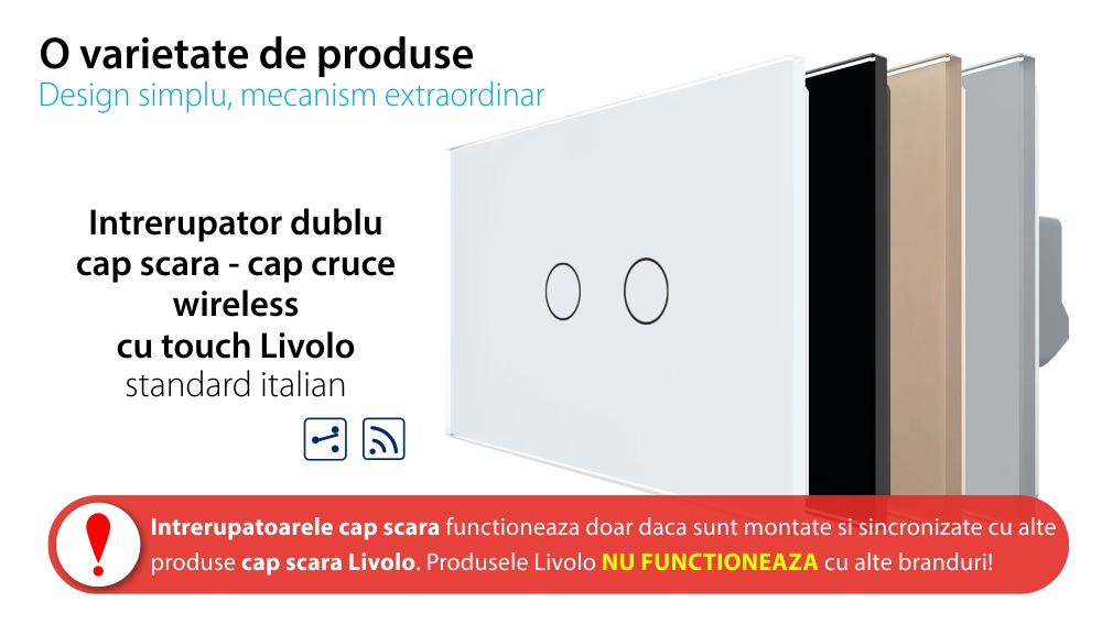 Intrerupator Dublu Cap Scara / Cruce Wireless cu Touch LIVOLO din Sticla – Standard Italian SmartElectro IntelligentHouse