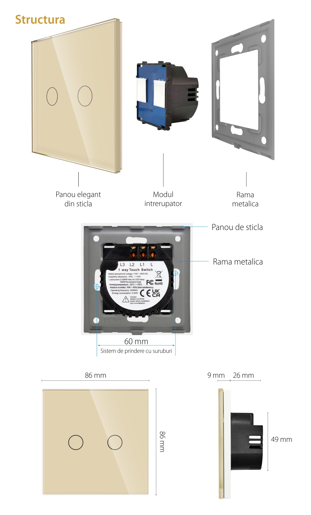 Intrerupator Dublu cu Touch din Sticla LUXION, 500W SmartElectro IntelligentHouse