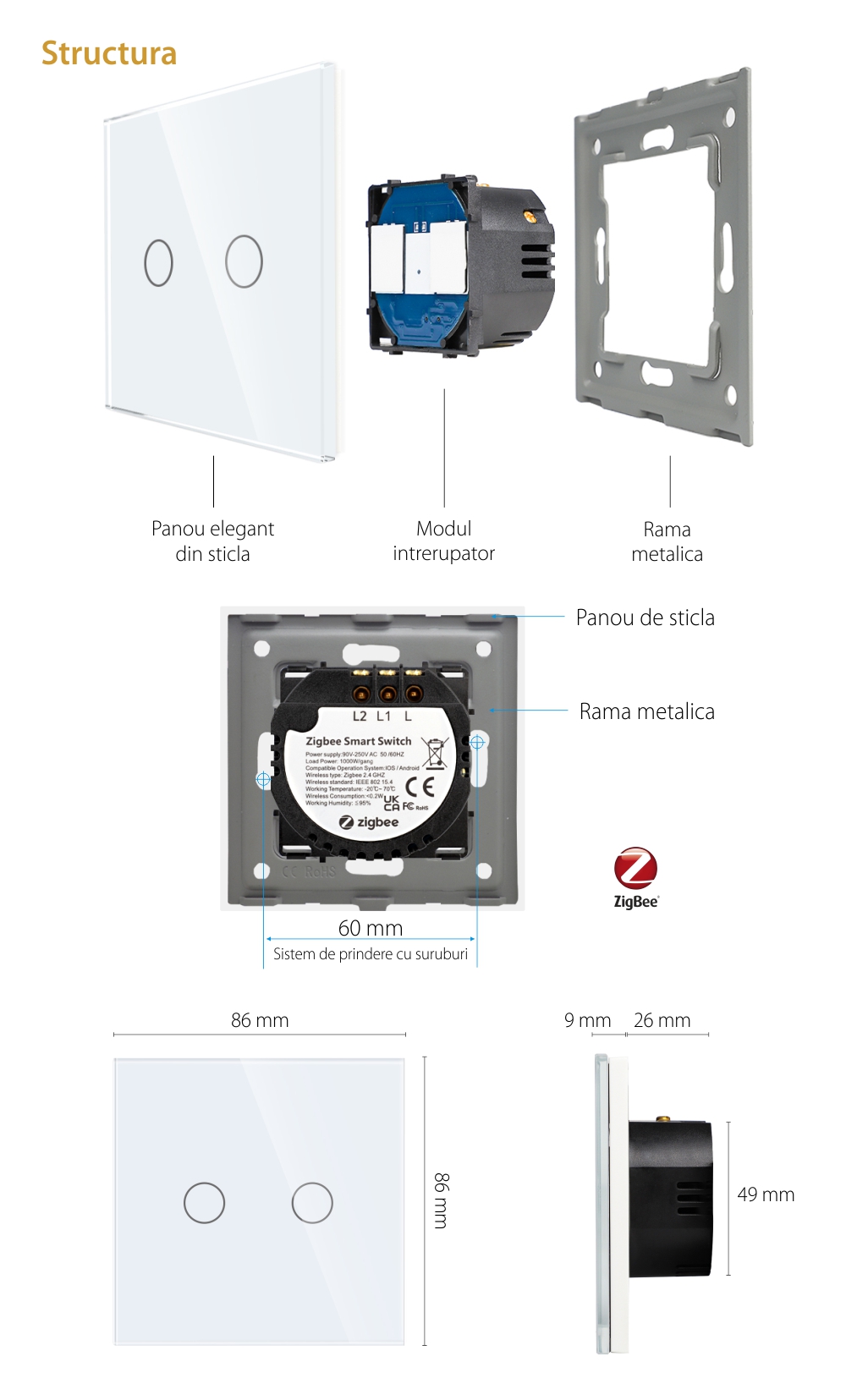 Intrerupator Dublu cu Touch din Sticla LUXION, protocol ZigBee SmartElectro IntelligentHouse