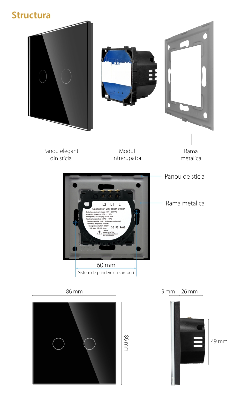 Specificatii Intrerupator Dublu Touch Sticla LUXION SmartElectro