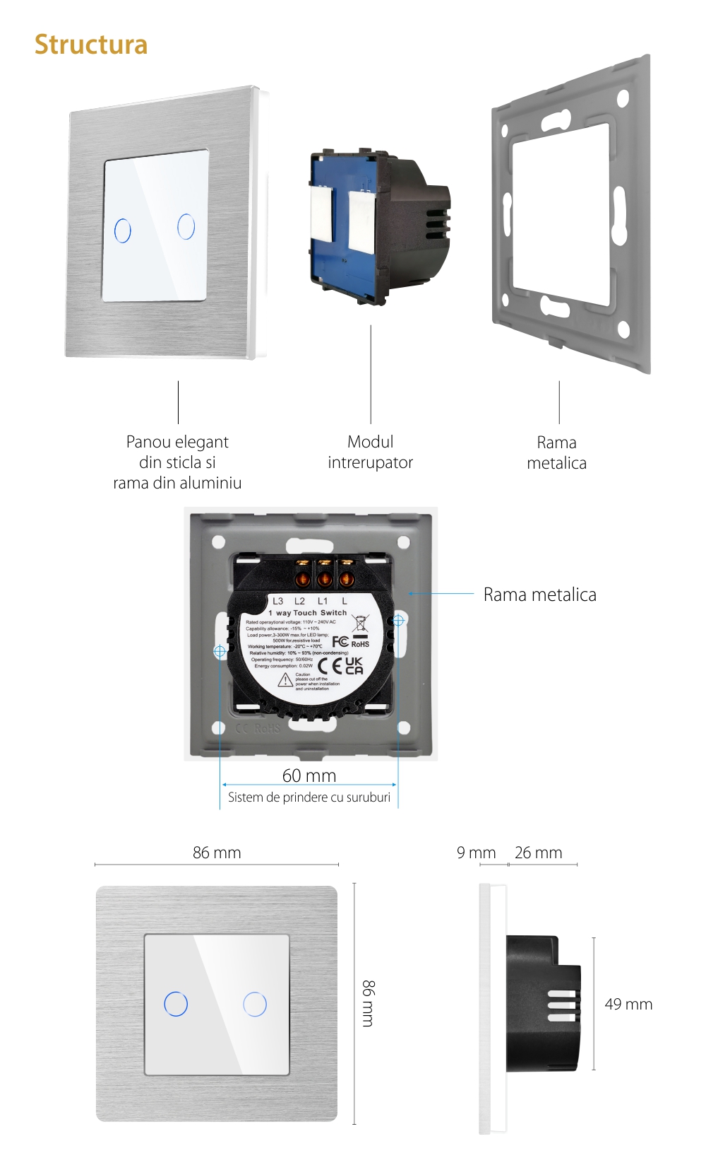 Specificatii Intrerupator Dublu Touch Sticla Rama Aluminiu