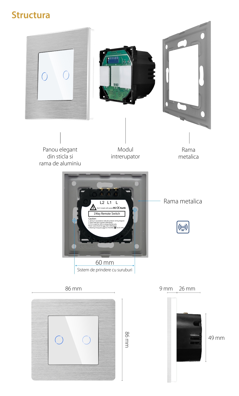 Specificatii Intrerupator Dublu Touch Sticla Rama Aluminiu