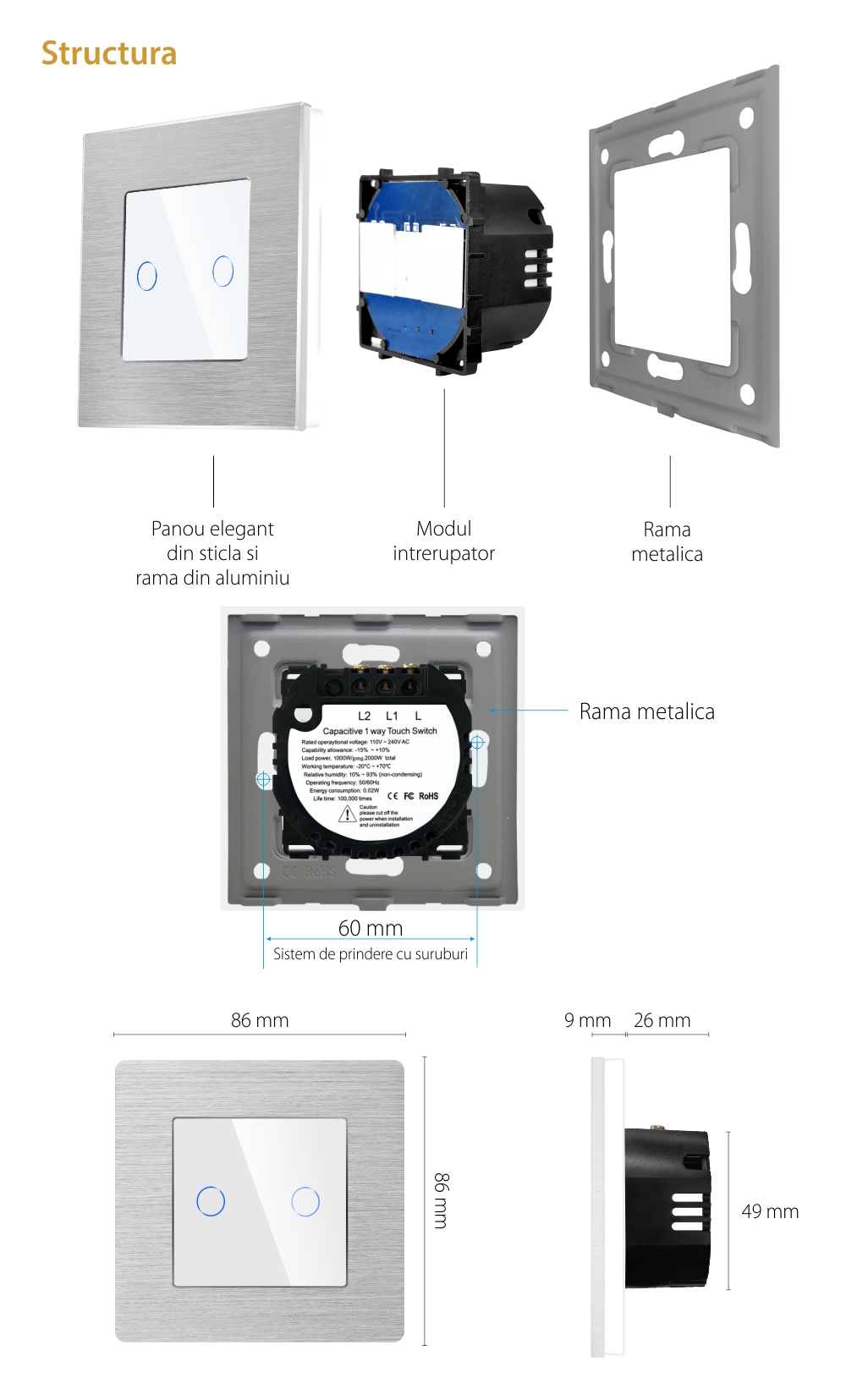 Specificatii Intrerupator Dublu Touch Sticla Rama Aluminiu