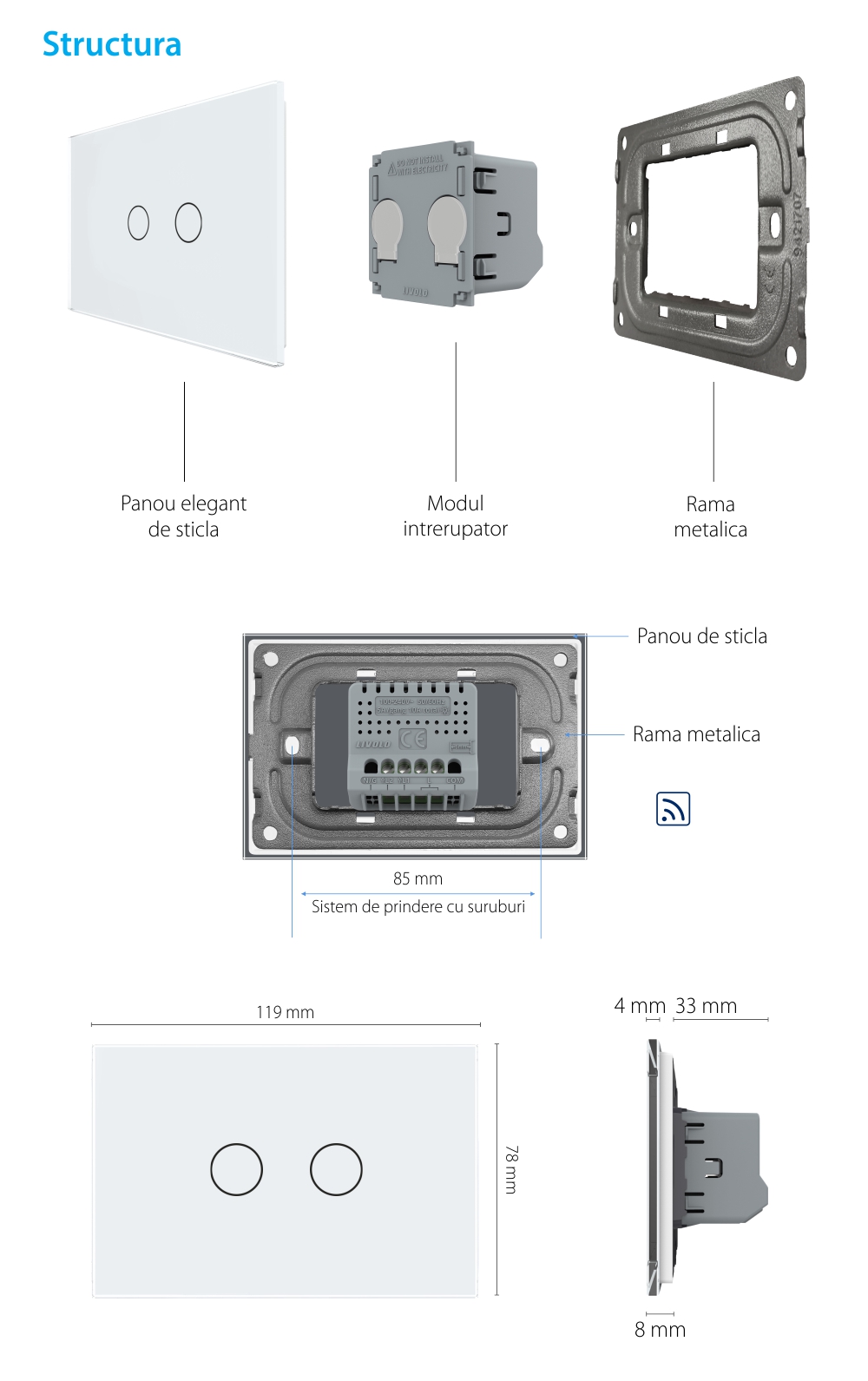 Specificatii Intrerupator Dublu Touch LIVOLO Sticla –