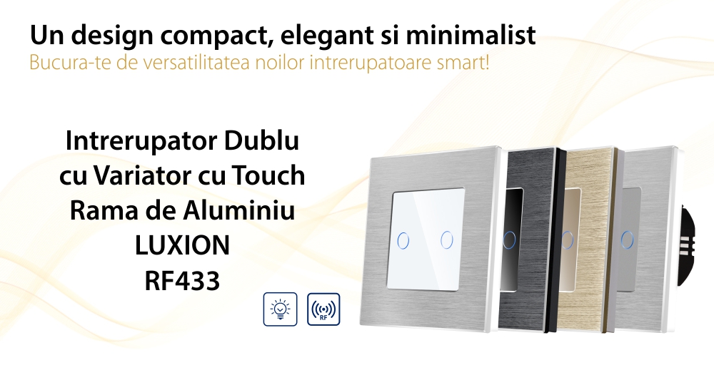 Intrerupator Dublu cu Variator si Touch din Sticla si Rama de Aluminiu LUXION, RF433 SmartElectro IntelligentHouse