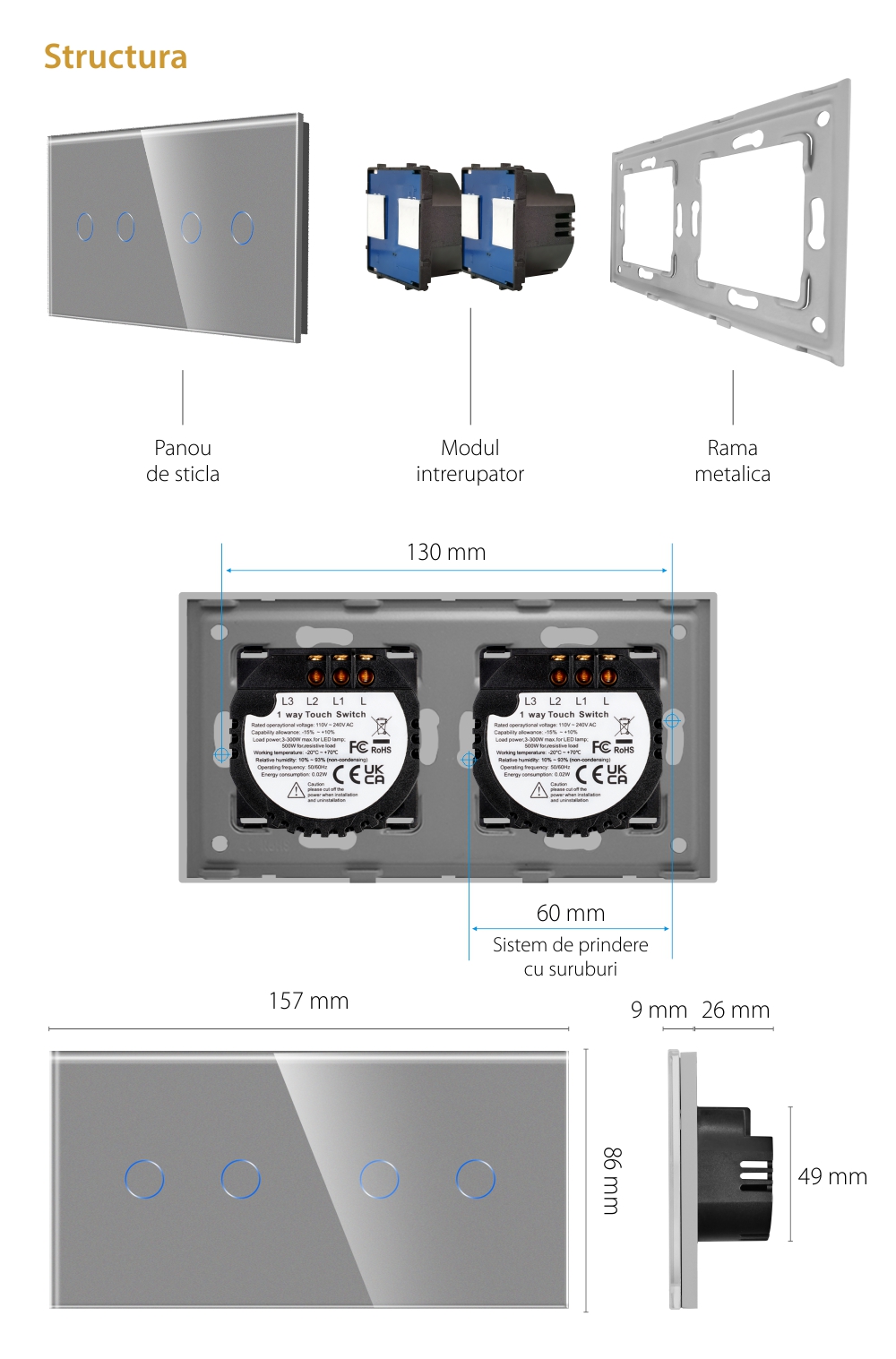 Specificatii Intrerupator Dublu + Dublu Touch Sticla