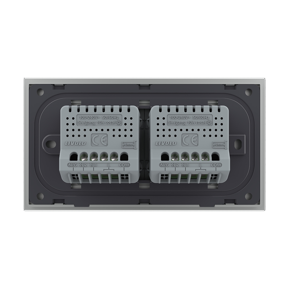 Intrerupator cu touch Livolo din sticla, standard Italian, dublu + dublu, compatibil cu doza modulara de 4 module cu distanta dintre suruburi 108 mm. Este rezistent la zgarieturi, umezeala, praf si ofera casei tale un plus de eleganta si rafinament.