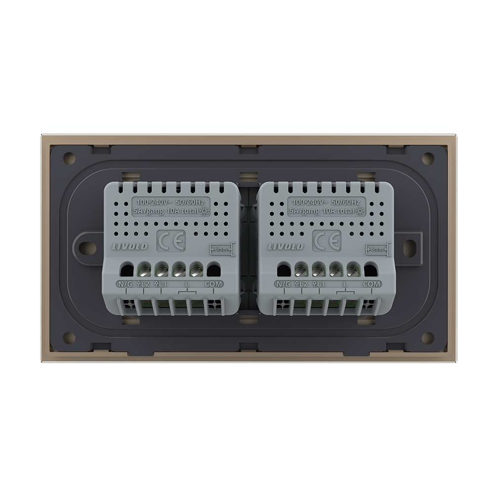 Intrerupator cu touch Livolo din sticla, standard Italian, dublu + dublu, compatibil cu doza modulara de 4 module cu distanta dintre suruburi 108 mm. Este rezistent la zgarieturi, umezeala, praf si ofera casei tale un plus de eleganta si rafinament.