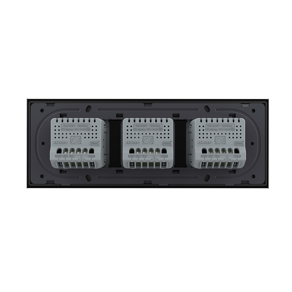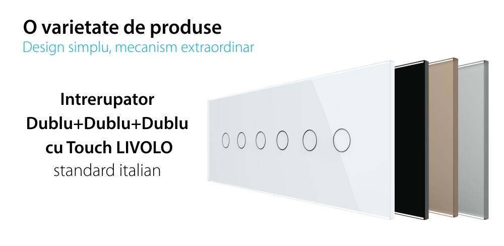 Intrerupator cu touch Livolo din sticla, standard Italian, dublu + dublu + dublu, compatibil cu doza modulara de 6 module cu distanta dintre suruburi 102 mm. Este rezistent la zgarieturi, umezeala, praf si ofera casei tale un plus de eleganta si rafinament.