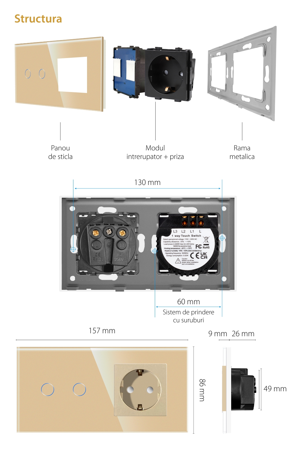 Specificatii Intrerupator Dublu + Priza Rama Sticla
