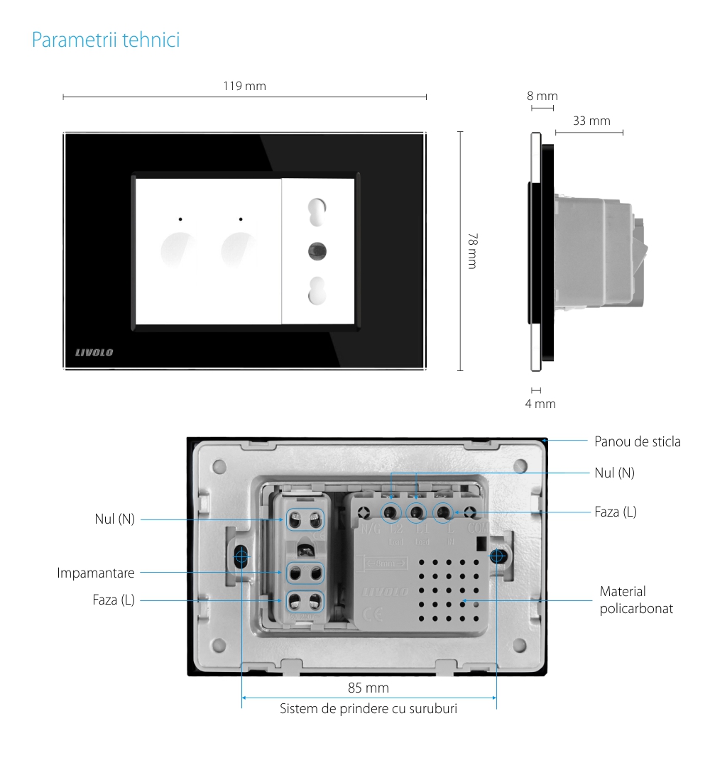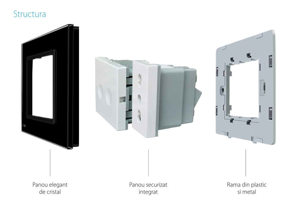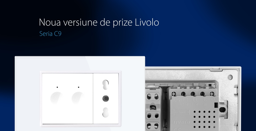 Intrerupator dublu + priza Livolo cu rama din sticla, Standard italian SmartElectro IntelligentHouse