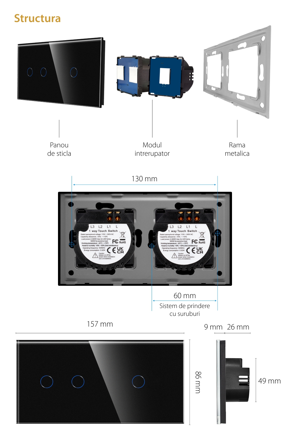 Specificatii Intrerupator Dublu + Simplu Touch Sticla