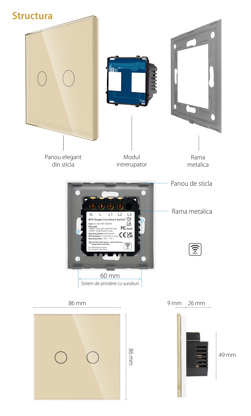Specificatii Intrerupator Dublu Wi-Fi Touch Sticla LUXION