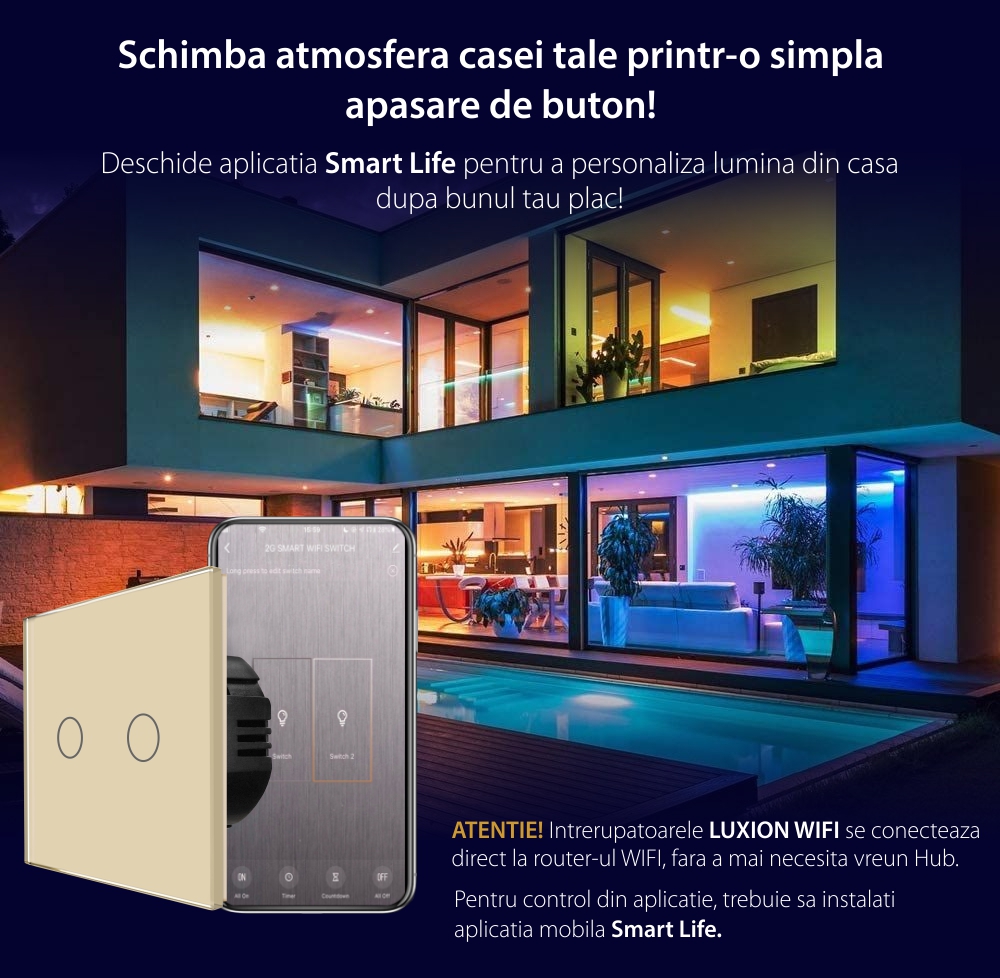Intrerupator Dublu Wi-Fi + RF433 cu Touch din Sticla LUXION SmartElectro IntelligentHouse