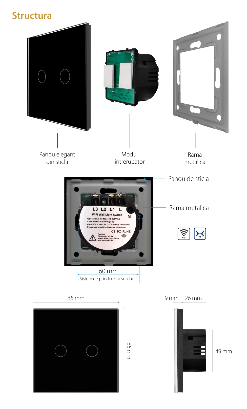 Specificatii Intrerupator Dublu Wi-Fi + RF433 Touch