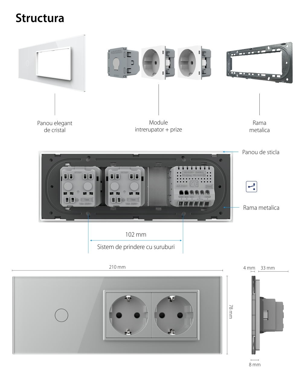 Intrerupator simplu cap scara/cruce + doua prize Livolo din sticla, standard Italian, compatibil cu doza modulara de 6 module cu distanta dintre suruburi 102 mm, compatibil doar cu modulele Livolo. Este rezistent la zgarieturi, umezeala, praf si ofera casei tale un plus de eleganta si rafinament.