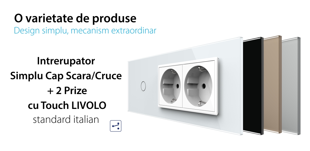 Intrerupator Simplu Cap Scara / Cruce + 2 Prize LIVOLO cu Rama Din Sticla, Standard Italian, 6M SmartElectro IntelligentHouse