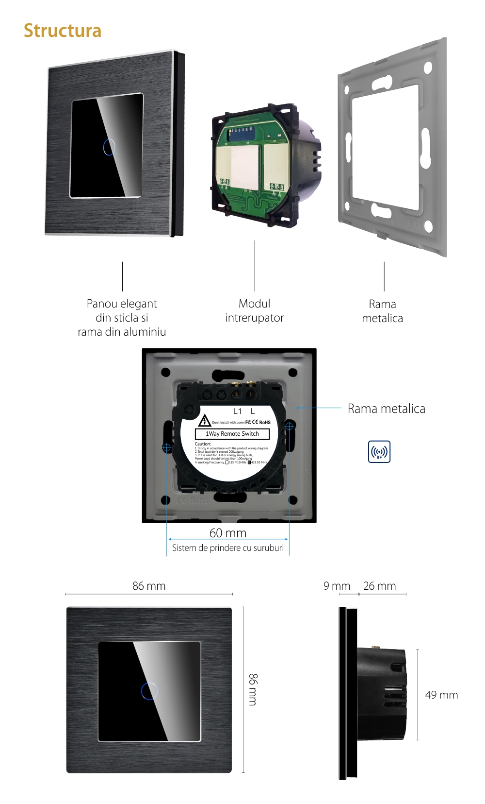 Specificatii Intrerupator Simplu Touch Sticla Rama Aluminiu
