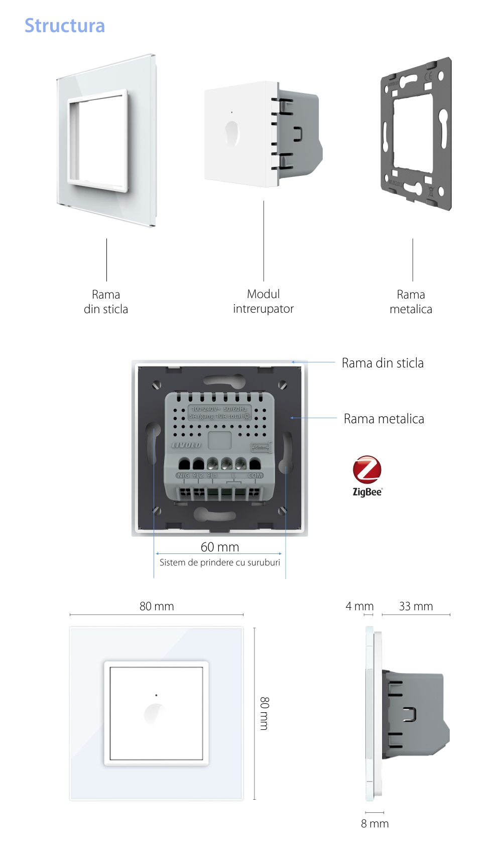 Intrerupator Simplu cu Touch LIVOLO cu Rama din Sticla - Protocol ZigBee EC SmartElectro IntelligentHouse