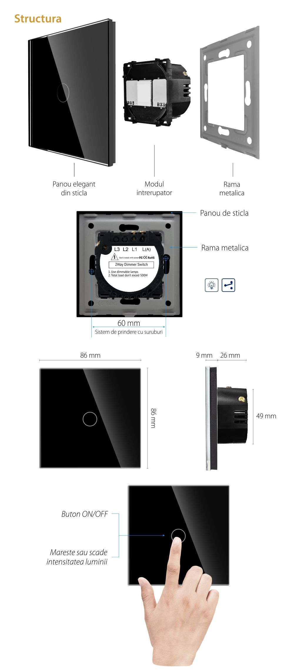 Intrerupator Simplu cu Variator Cap Scara / Cruce cu Touch din Sticla LUXION SmartElectro IntelligentHouse