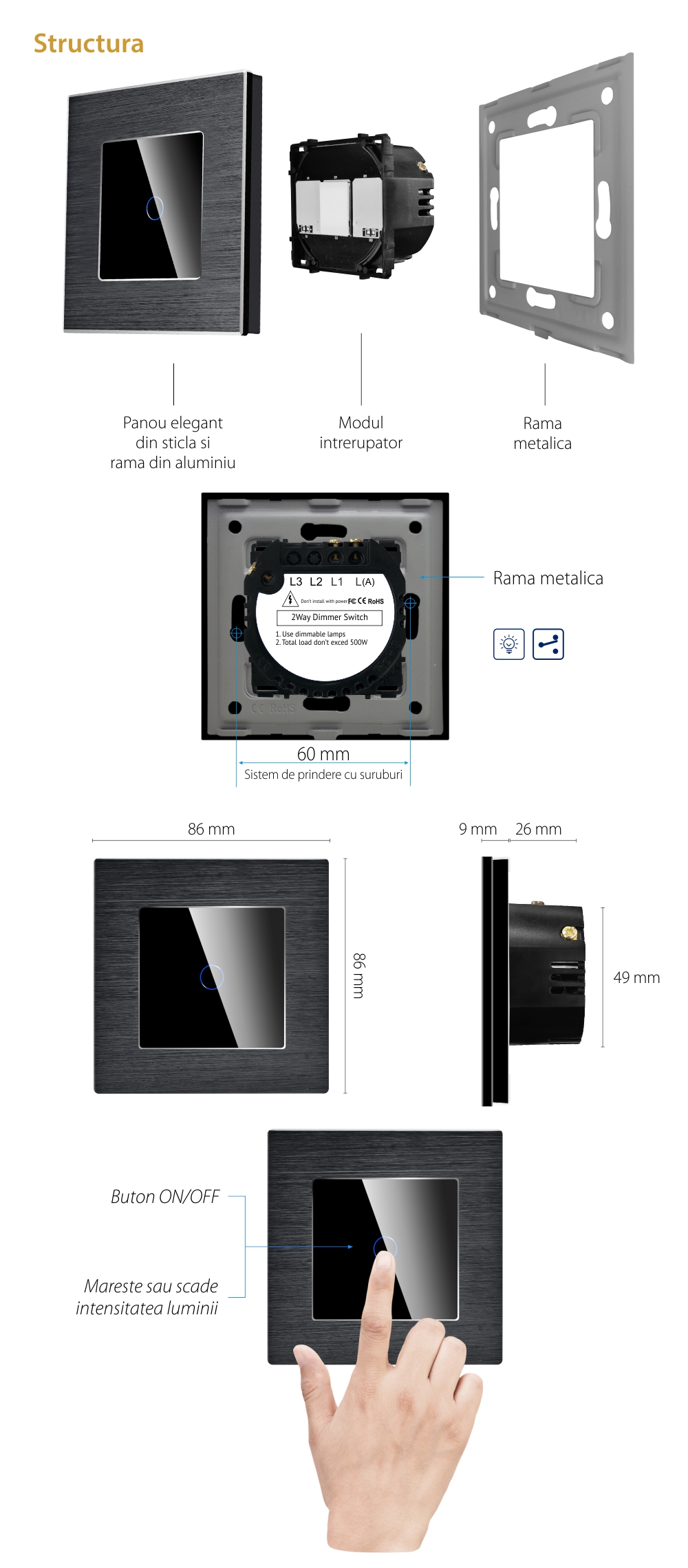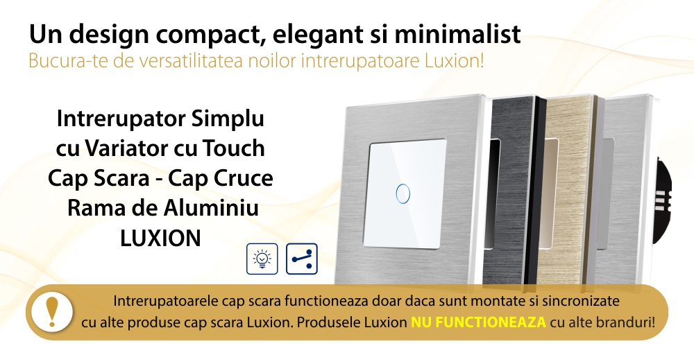 Intrerupatoarele LUXION se diferentiaza prin design-ul compact, elegant si minimalist. Sunt versatile, iar senzorul tactil este foarte precis, identic cu cel al unui smartphone. Structura este durabila, iar intrerupatoarele nu se decoloreaza in timp. Este un produs practic, fabricat din materiale de calitate si rezistent in timp, ce ofera utilitate si confort casei tale. Este compatibil doar cu alt intrerupator cap scara cu variator! Se pot conecta maxim 3 intrerupatoare in circuit (cap cruce)