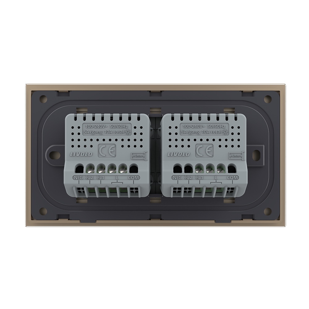 Intrerupator cu touch Livolo din sticla, standard Italian, simplu + dublu, compatibil cu doza modulara de 4 module cu distanta dintre suruburi 108 mm. Este rezistent la zgarieturi, umezeala, praf si ofera casei tale un plus de eleganta si rafinament.