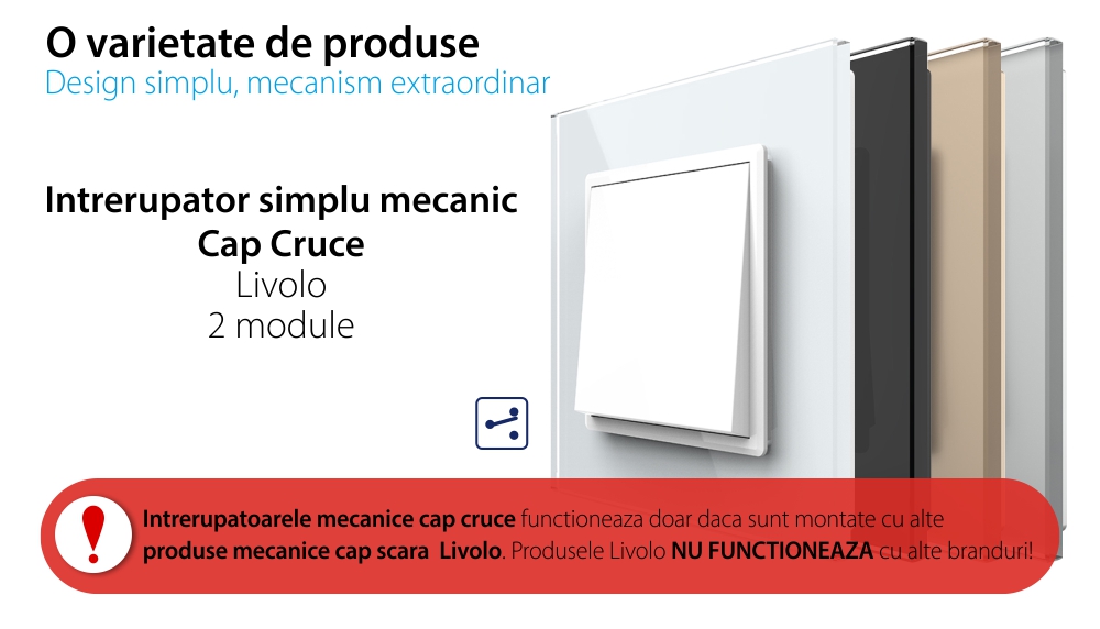 Intrerupator Simplu Mecanic Cap Cruce, 2 Module LIVOLO cu Rama din Sticla - Serie Noua SmartElectro IntelligentHouse