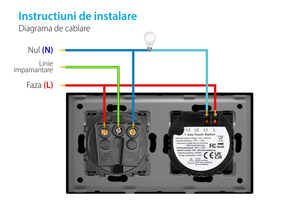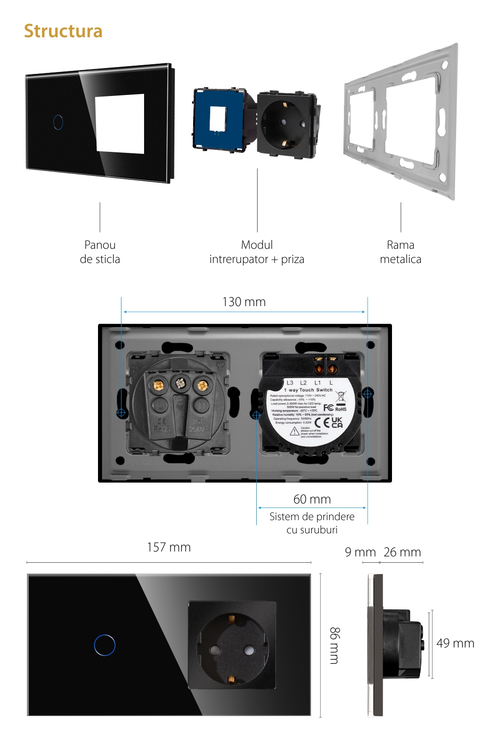 Specificatii Intrerupator Simplu + Priza Rama Sticla