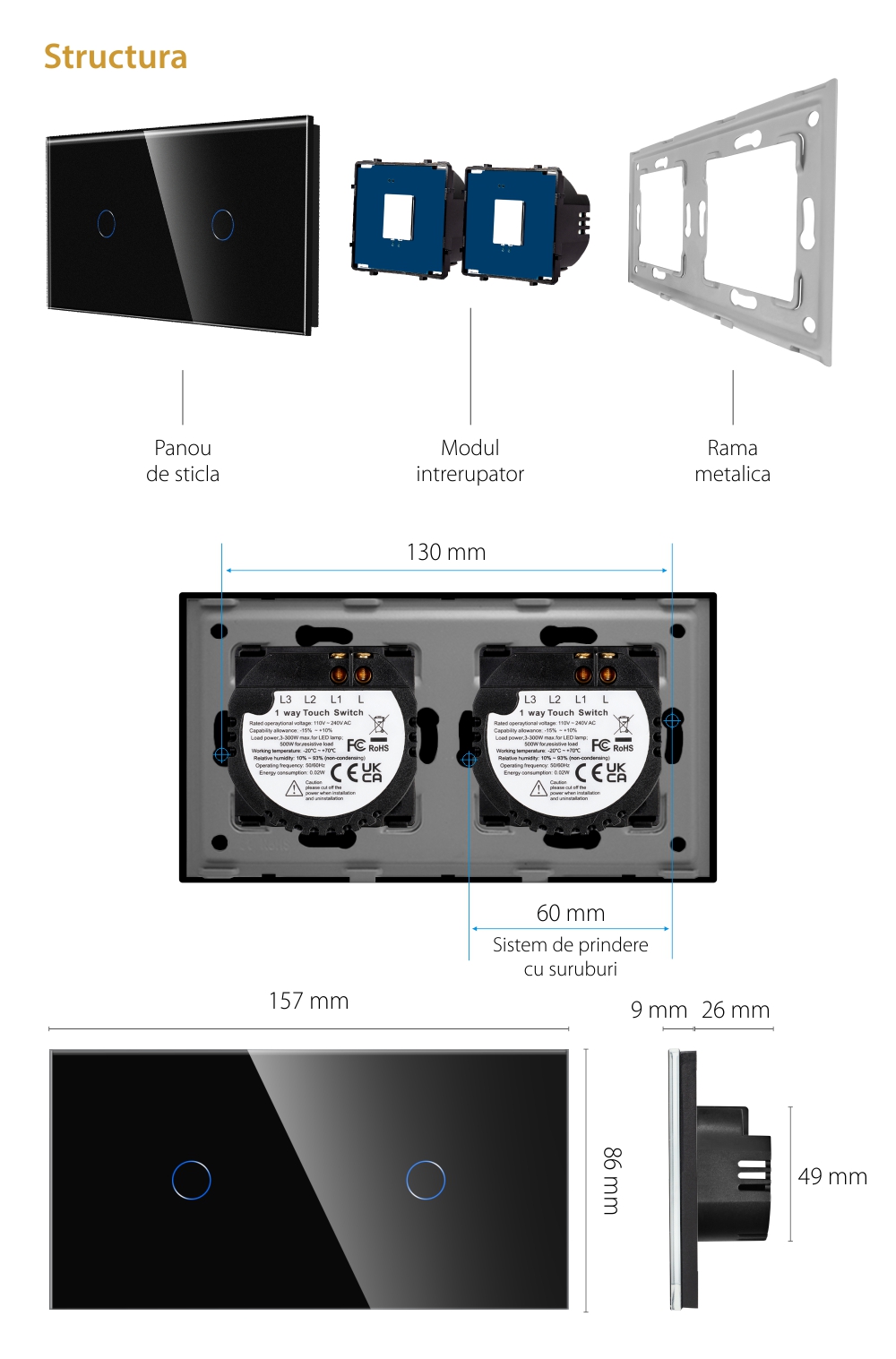 Specificatii Intrerupator Simplu + Simplu Touch Sticla