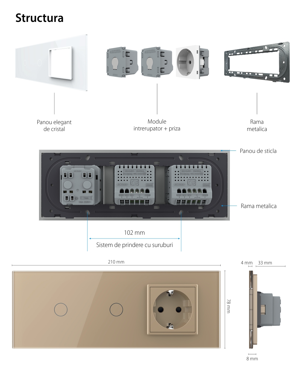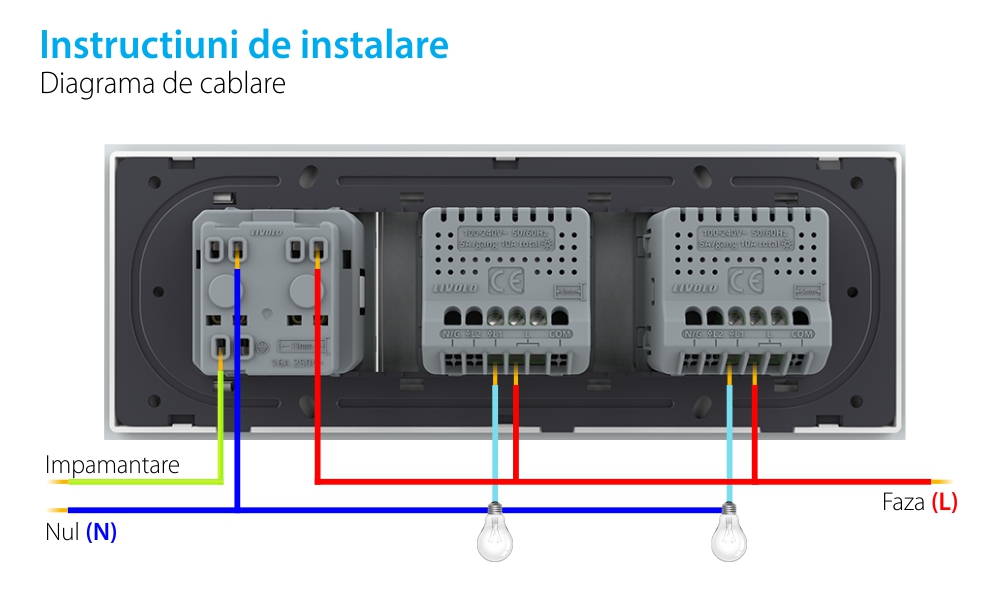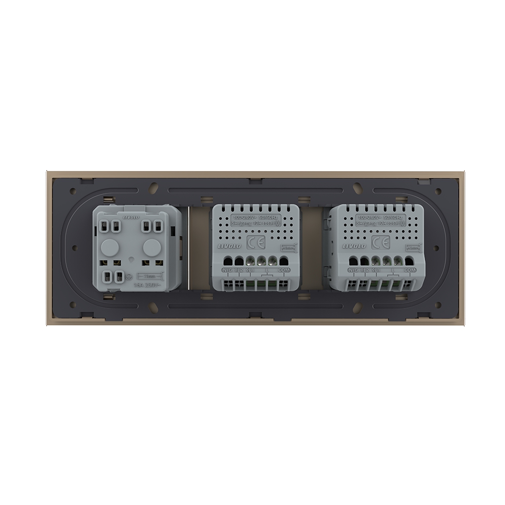 Intrerupator Simplu + Simplu + Priza LIVOLO cu Rama Din Sticla, Standard Italian, 6M SmartElectro IntelligentHouse