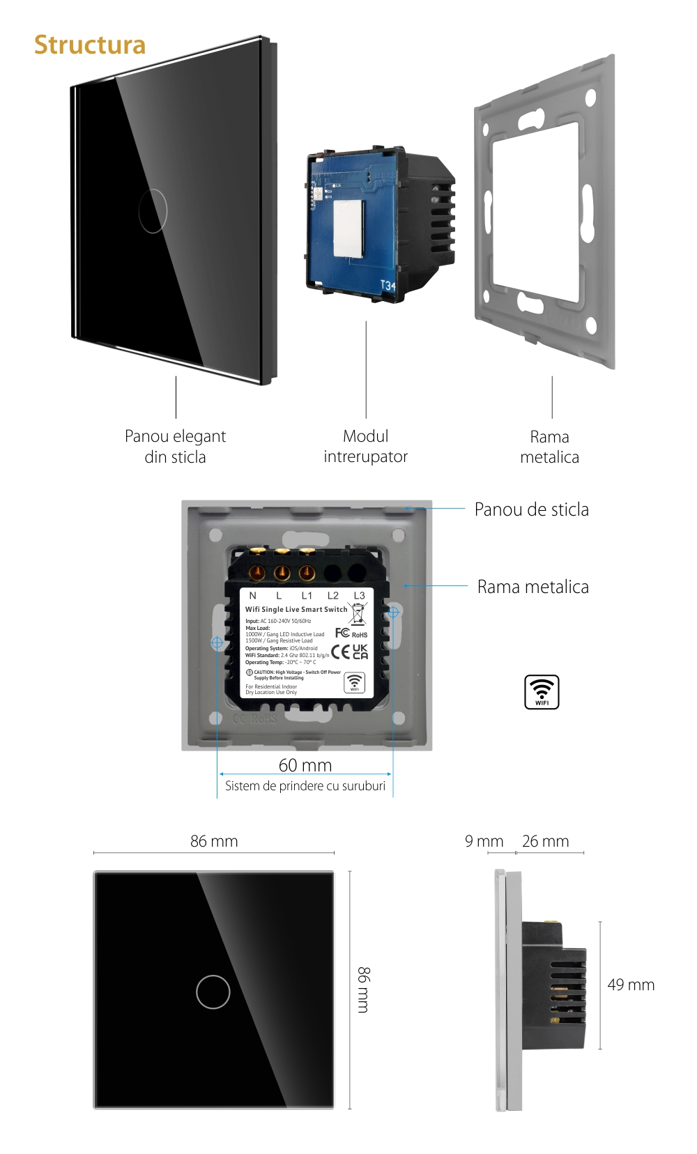 Specificatii Intrerupator Simplu Wi-Fi Touch Sticla LUXION