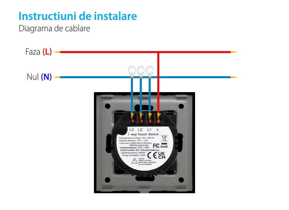 Specificatii Intrerupator Triplu Touch Sticla LUXION, 500W