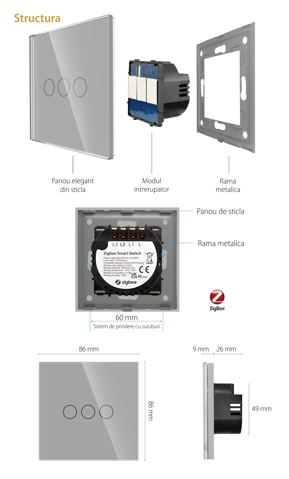 Intrerupator Triplu cu Touch din Sticla LUXION, protocol ZigBee SmartElectro IntelligentHouse