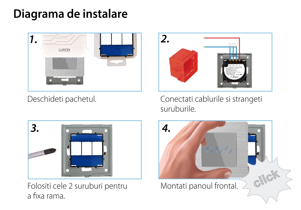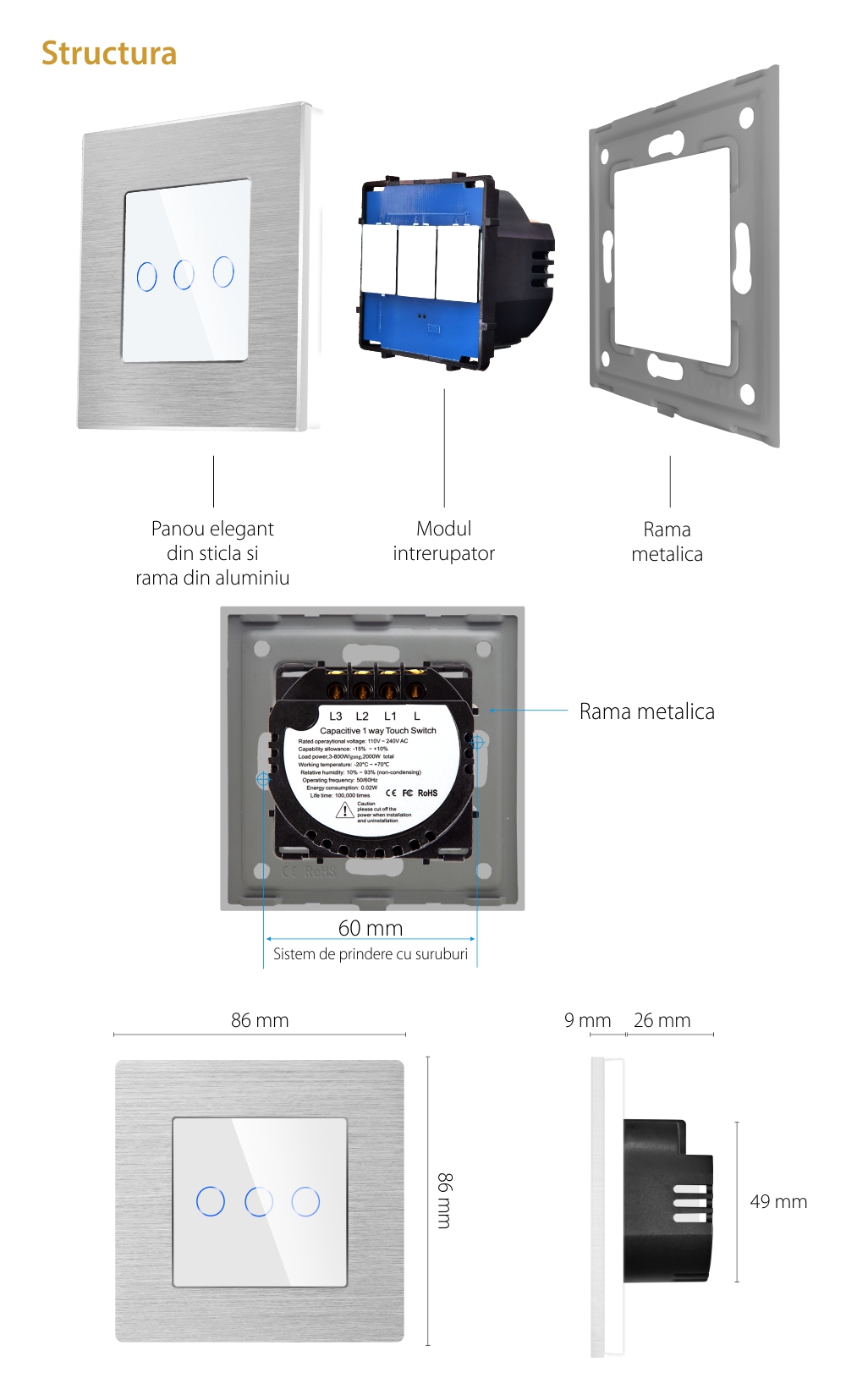Specificatii Intrerupator Triplu Touch Sticla Rama Aluminiu