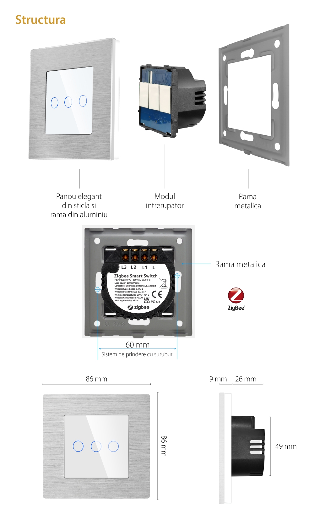 Specificatii Intrerupator Triplu Touch Sticla Rama Aluminiu